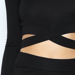 Add some bold vibes to an elegant nighttime outfit! This juniors set features a crop top with long sleeves, a high-rise neckline, & a self-tie bow on the back. Includes matching midi skirt with a form-fitting style. Wear this outfit with a pair of glittery heels & cute earrings for a wild look.