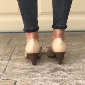 Studs embellish the bow front of a covered platform wedge.
