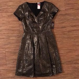 NWT Vince Camuto Metallic Gold and Black Cap Sleeve Lurex Jacquard A-line dress. This would be great for a party, special occasion, or homecoming.