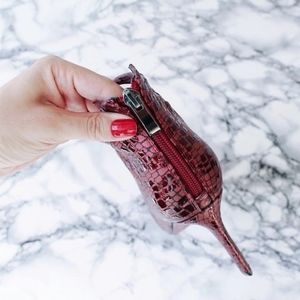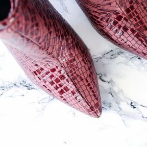 vegan leather, kill you if I need to stiletto, pointed toe, rubber sole, true to size, stunning paisley pattern in a shift color that is sometimes pink/red and in other light maroon/purple. bundle to get a discount.