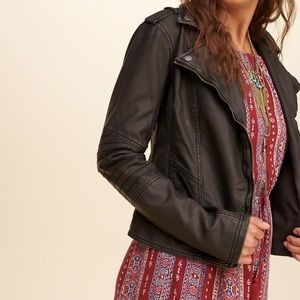 Genuine, it's almost brand new Hollister Faux Leather Biker Jacket, size S. Distressed Charcoal fabric. Hollister logo on buttons and zip tags. Collar is wired so can bend for a smooth or bumpy look. Can be worn 2 times...I reside Florida which is warm through the year. I didn't have an opportunity to wear this so much.