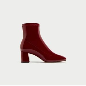 Burgundy high heel faux patent ankle boots with side zip fastening and lined medium heels