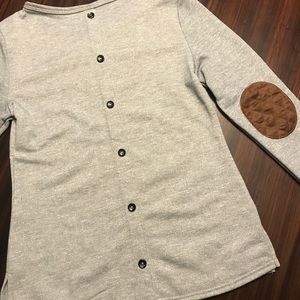 Unique sweater. Never washed or worn. Bought from a boutique, but didn't end up fitting and I can't return it. Size medium, but fits more like a small. Cute elbow patches, buttons down the back, and flattering style!