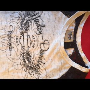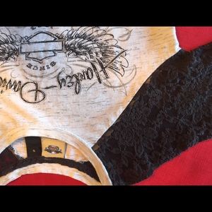Harley Davidson 3/4 sleeve cream and black top with lace sleeves and bling emblem. Size Small.