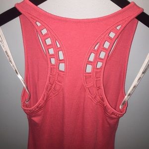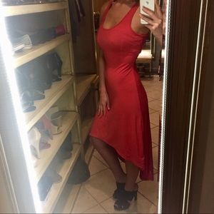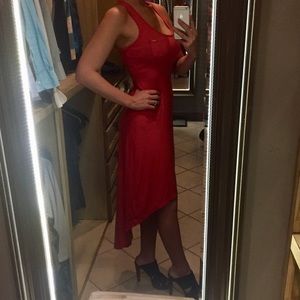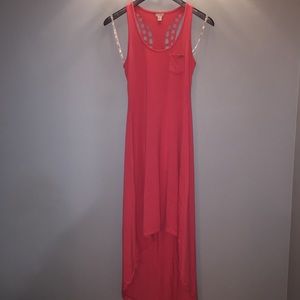 Previously worn a few times. Very soft and pretty dress. Crochet racer back detailing and high low bottom. Has pocket with GUESS emblem.