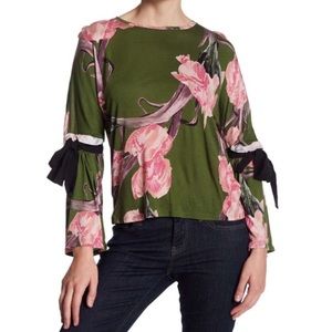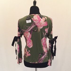 New With Tags- unique floral top with crew neck, long bell sleeves with black ribbon ties at elbows and lightweight knit construction. 100% Viscose. SIZE 2: Bust 37", Length 21". SIZE 4: Bust 38", Length 21".