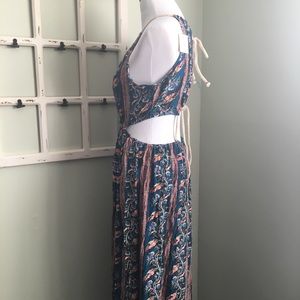 This is a MUST HAVE maxi dress! In a Beautiful teal with floral vine print. Has elastic by hips & adjustable lower back strings so you can decide how much you would like to cover or show & has a long slit by left leg