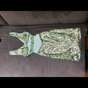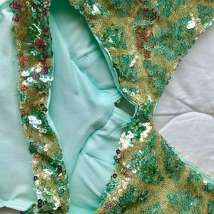 Yes it is very stretchy. The tag says: self: 100% nylon mesh, lining: 100% polyester. The color of its is green and gold, all sequins.