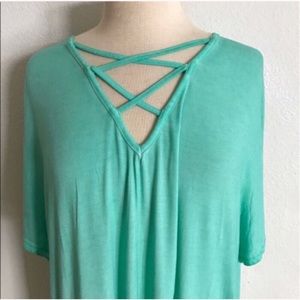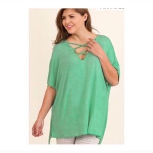 60% cotton/ 40% polyester. Super soft and stretchy! Mineral wash (areas of very slight fading- manufacturer made, not damaged). High low style. Measurement is shortest/ longest points.