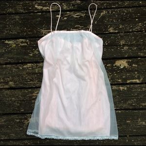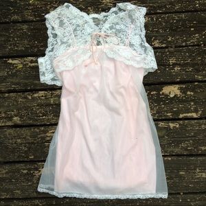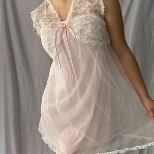 Two piece tricot nylon pastel pink dress with a lil lace over top vest thing. Lined sheer dress vintage marked a medium made in America ! USA