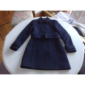 This is a gorgeous navy blue double cloth coat by J.Crew. Size 4. 75% wool, 25%nylon. Polyester lining. Long sleeves, fitted cut. Perfect for winter!