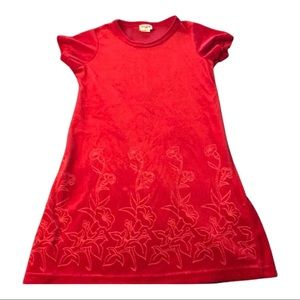 EUC red velvety girls dress size 7/8. Dress has glittery flowers on the bottom front of the dress. Super cute. Laying flat measures 13” from armpit to armpit and 25” from shoulder to bottom.
