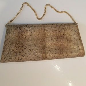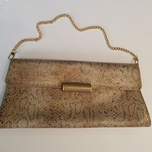 BCBG Max Azria large clutch with chain. Reptile metallic embossed print. Black&gold leather with gold silk liner. Metallic gold leather trim throughout. 14" wide at bottom.