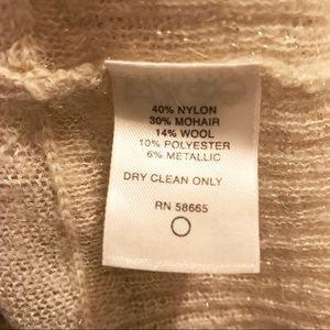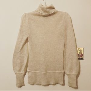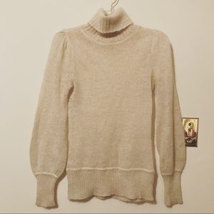 Off-white with subtle sparkle (6% metallic); sheer knit sweater; rib knit at turtleneck, end of sleeves, and hem; slight gathering at shoulder; slightly bellowed sleeves; size XS; made in Hong Kong.