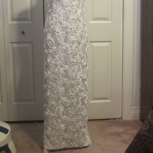 Has rose detail and sequence. V-neck front & back. I wore it on my wedding day & never since. I've lost some weight but if you want to see it on I can add pictures. Was keeping but my closet is too small & I'd rather have stuff in it I wear consistently. I still have the receipt as well to show what I pd for it.