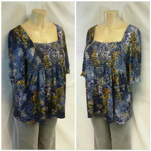 REQUIREMENTS Beautiful Blue-based Babydoll Top, size Large See Measurements, elastic stretch bust area, ruffled chest and sleeve hems, extra long length, elbow length sleeves, beautiful pattern material, machine washable, 100% polyester, approximate measurements: 27" length shoulder to hem, 19" bust laying flat with front center all elastic stretch, 13 1/2" sleeves. SAVE BIG! AUTOMATIC 30% BUNDLE DISCOUNT! ADD TO A BUNDLE!
