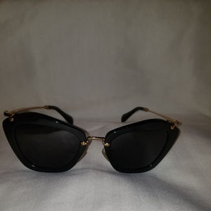 Black hard plastic sunglasses; dark lenses with gold trimming. Worn no more than 10 times in 2 years. Practically still new with no scratches. Receipt and original box included.