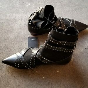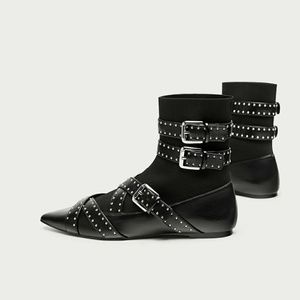 Flat black ankle boots. Contrasting materials. Buckled strap detail. Pointed toes. Buckled straps for fastening.