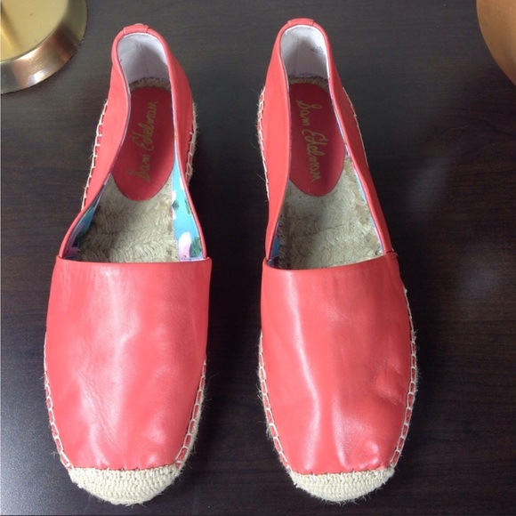 Vibrant red leather slide on espadrilles that will add a pop of color to your wardrobe. Features silver Sam Edelman logo on the back heel. Like new, worn only a few times. In excellent condition with no visible scratches or marks. Thanks for your interest! Please checkout the rest of my closet!