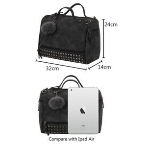 Back in stock! Brand new. Vegan (PU) Leather Studded Bag. Can be be worn shoulder style or crossbody style (unless you are super tall or have very long torso). Straps are not adjustable and are approximately 34” long from end to end. Includes Pom Pom charm. Size - 12.6” x 9.4” x 5.5”. Color - Light Grey. Last picture for size references only. No brand tag and material tag. Please ask all questions before purchasing.