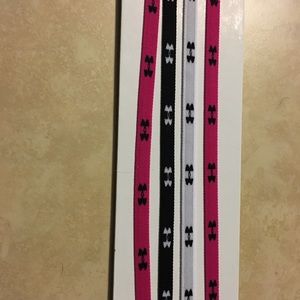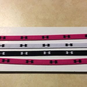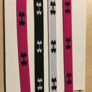 This is a set of 4 headbands. They are still on the cardboard and have never been used. They are pink (2), black (1), and white (1). The under armour symbol goes around the entire headband. I have others just like this, probably too many, and they always stay out during yoga and other workouts.