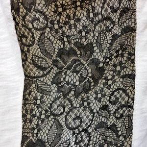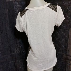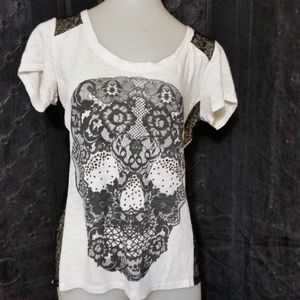 This tee is in good condition. No stains, hole or other defects. Sheer black lace on the shoulders and down each side of the shirt.own each side of the t-shirt. Small jeweled beads on the eyes and nose of the skeleton.