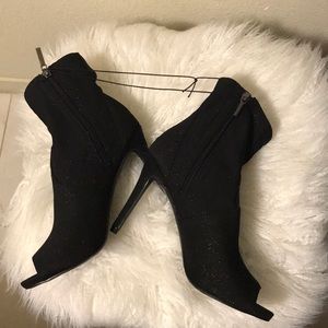 New without box pair of Steve Madden Boots. Steve Madden Black Karisa Shimmer Stretch Peep Toe Sock Booties. They feature a glitter sheen black fabric upper. Boots are peeptoe and have side zippers. 4 inch heel