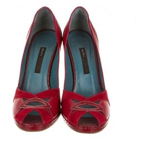 PRODUCT DETAILS: Red suede and leather Marc Jacobs peep-toe pumps with contrasting stitching, embossed panels throughout, cutouts at vamp and covered heels. Size: 7.5 In VGUC (Very Good Used Condition). Wear at soles. Leather insoles added. Heels 4”, Platform 0.25"