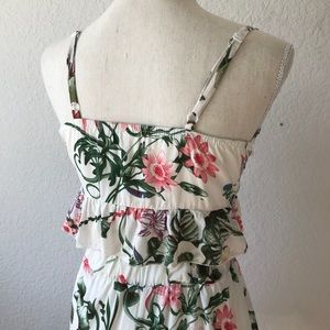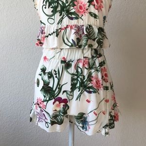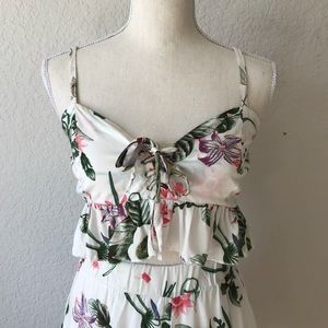 Really cute cropped bustier spaghetti strap tank top, detailed with criss cross lace up bust and flouncing. Comes as a set with matching high waisted shorts. Set is white with a beautiful floral pattern. Size small. BRAND NEW. NEVER WORN. NO TAGS. Please check out my closet, I also have this item available in black.