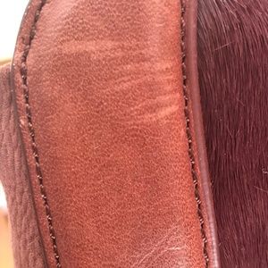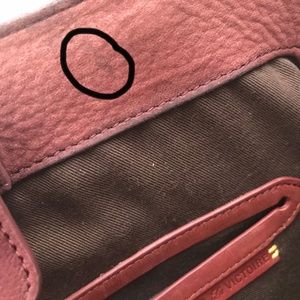 This is a Pour La Victoire Burgundy Butler Tote Bag. This item is gently used, has a very small scuff on part of the leather handle, and has few imperfections throughout, as seen in pictures! The inside of bag looks in perfect condition.