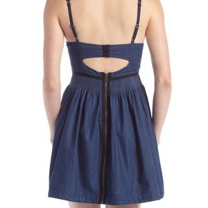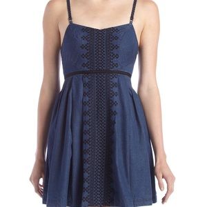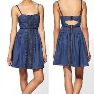 Denim with geometric embroidery down front. Sweetheart neckline; strap across open back. Adjustable thin shoulder straps. Smocked natural waist with thin banded trim. Pleated A-line skirt. Exposed back zip. Cotton. Machine wash.