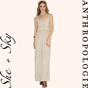 Anthropologie brand, She & Sky! SPAGHETTI STRAP MAXI DRESS WITH CROCHET LACE REMOVABLE TOP WITH FRINGE *MODEL IS 5`11"