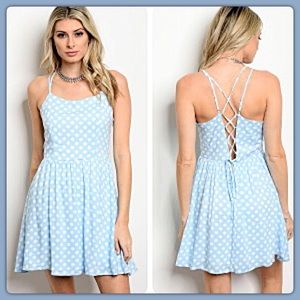 🌴ADORABLE BABY BLUE DRESS WITH WHITE POLKA DOT PATTERN FEATURES FIT AND FLARE SILHOUETTE, ROUNDED NECKLINE, LACE UP BACK.