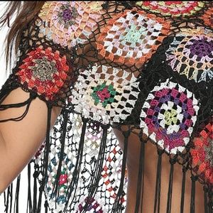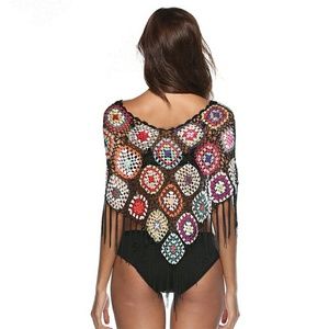 Beautiful granny square poncho with a new twist, tiny sparkle beads and fringe! Delicate pattern. Please see measurements above in CM. Brand new boutique item Nwot never worn.