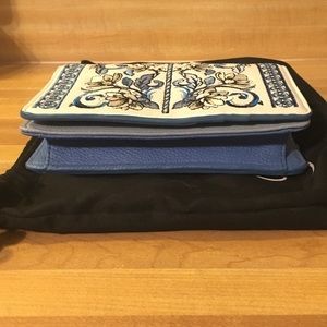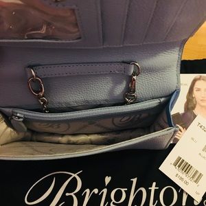 Authentic, brand-new Brighton Bella Capri Embroidered Mini Organizer. Style #T43296. Features beautiful embroidery; dark & light blue leathers; silver hardware; exterior slip pocket; top handle with 2" drop; "Love blooms from within" written in script; fabric lining; 4 interior card slots & slip pocket on top; slip pocket, zip pocket, and larger main compartment on bottom; detachable chain strap; snap closure. Sweet and beautiful piece! Includes dust bag. Offers are welcome. 💙