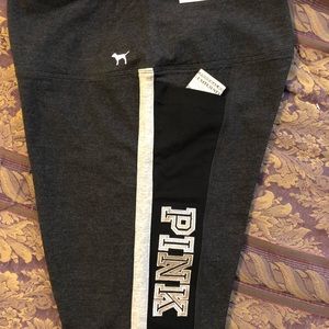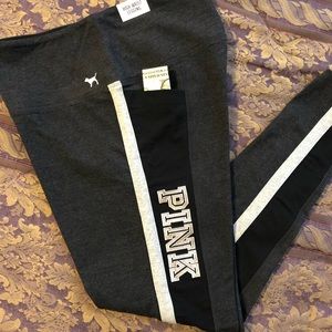 Awesome Victoria “Pink” leggings, NWT, nice sequins letter. Never been worn. No rips, stains or odors. Comes from smoke free pet free home.