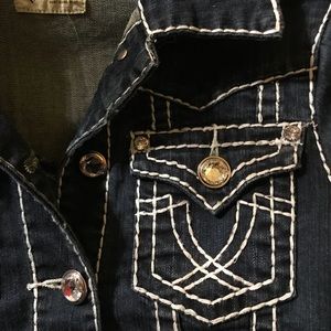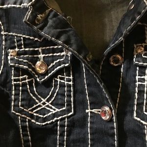 Denim jacket - heavy white stitching - pretty sparkly rhinestone buttons down front, on breast pockets, cuffs and waistband. Bought in Nashville, TN. Bust and waistline are 36”. Collar to hem measures 22” down. Shoulder seam to sleeve hem measures 25” down.