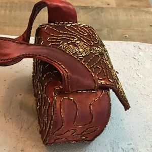 A true vingg bag. Red satin with god bead embroidery structured bad. Snap closure.