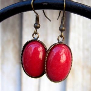 Red mountain jade oval stones set in brass. Stones measure 18mm x 13mm. Leverback closures. Earrings are 1.25” top to bottom. Only worn for pictures.