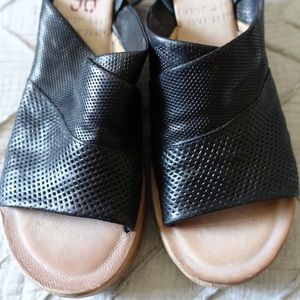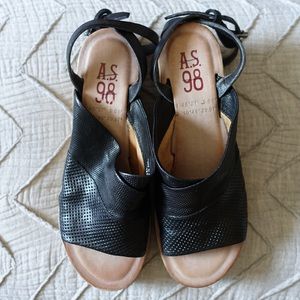 Leather wedge featuring an adjustable strap that wraps effortlessly around the ankle.