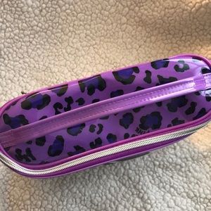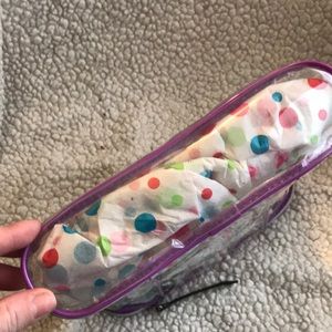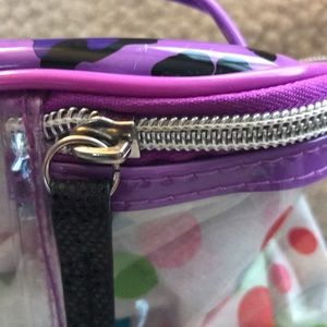 Such a super cool travel companion, this is I love pink! Clear travel bag with purple accents I have poker that tissue paper inside just so you can see the cuteness.
