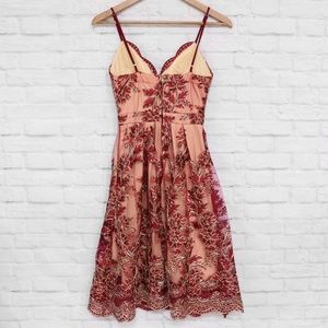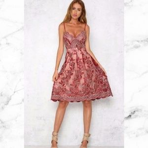 tags: maroon wine burgundy dress dresses metallic scallop gold lace prom special occasion wedding shower bridal party homecoming fit and flare flared bottom skater dresses midi