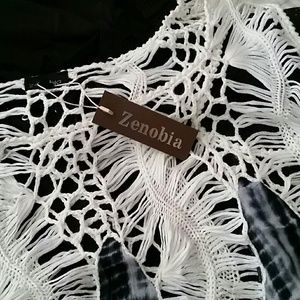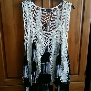 Sleeveless, relaxed fit with tie dyed fringe and crochet details.