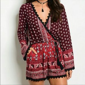 Burgundy/red/black Bohemian style romper, rope tassel style belt, embroidery lace edging detail, Hazley/floral design. Price is firm! No trades!