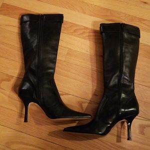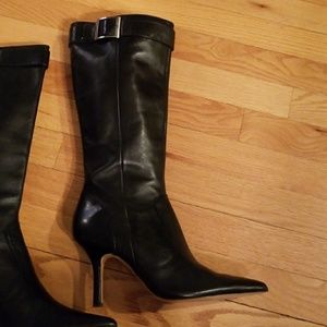 Anne Klein Black leather boots with nice silver buckle detail on outside of boots. They have zippers that allow you to zip them on and off.
