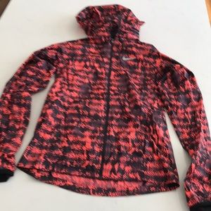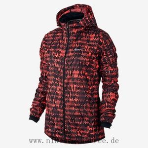 Nike women’s running windbreaker athletic coat jacket with bright deep orange and black graphics
