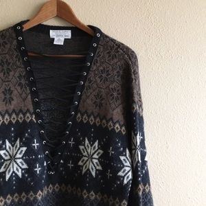 Winter sweater in a brown and slate pattern with black lacing down the center. Tricots St. Raphael MATERIAL: merino wool YEAR/ERA: 80s LABEL SIZE: L fits small or medium in my eyes