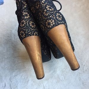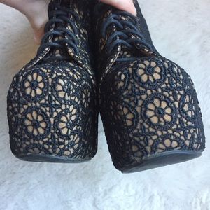 Item: Jeffrey Campbell Daisy Crochet ‘Lita Mac’ Black & Nude (tan) Lace Up Platform Booties with chunky wood heel