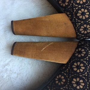 Condition: Good pre-owned - bottoms show wear, some tarnishing on hardware, wooden heels have some scuffs/discolorations & tan fabric shows some wear/marks (barely noticeable due to the overlay, see pics)