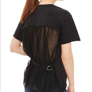 Add a little intrigue to your casual look in a comfy cotton tee with ruffled tulle back. Crew neck, short sleeves, grosgrain belt with D-ring buckle. Machine wash dry flat. Black color.